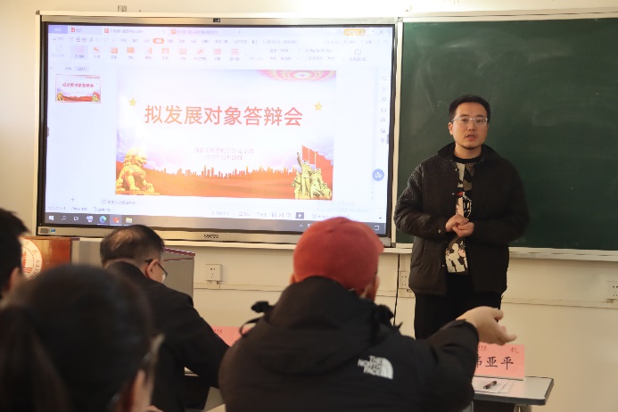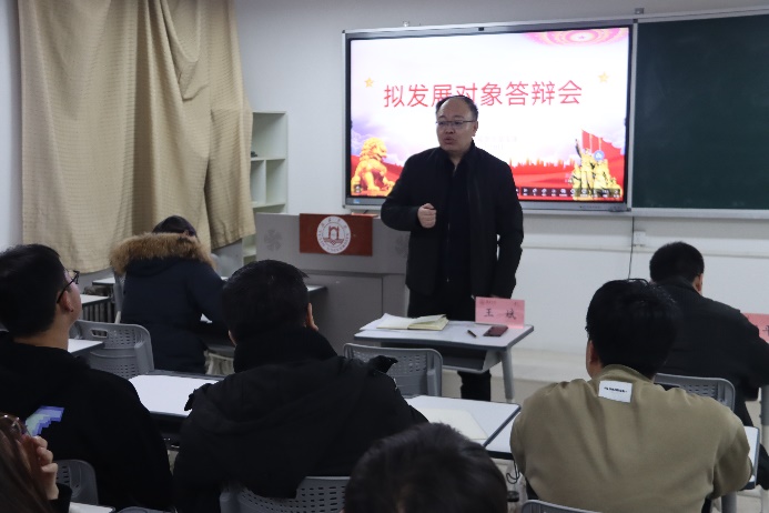 党员发展工作为党组织提供新鲜血液,是党员队伍建设的重要组成部分,为充分发挥基层党支部的战斗堡垒作用,做好党员发展和教育工作,11月29日,太阳成tyc234cc学生党支部在1号教学楼208教室组织召开学生拟发展对象汇报答辩会。太阳成tyc234cc党总支书记王斌、学生党支部书记韩亚平、辅导员老师祁琦参加答辩会,56名学生拟发展对象依次进行汇报答辩。