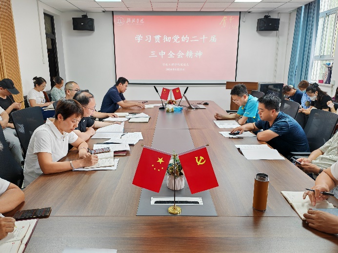王斌结合学院发展情况对进一步深入学习全会精神提出以下要求:一是要深学细悟,要把学习贯彻党的二十届三中全会精神作为当前和今后一个时期的重大政治任务,深刻领会全会精神,在全院范围内掀起学习贯彻全会精神的热潮。二是要学用贯通,把握学习重点,将深入学习领会全会精神转化为推动学院高质量发展的强大动能,深刻领会“教育、科技、人才是中国式现代化的基础性、战略性支撑”的判断,进一步加强谋划,健全体制机制,推动学院各项工作迈上新台阶。三是要学以致用,结合学院重点工作,将学习贯彻全会精神与推动课程思政教学改革紧密结合在一起,提升教育教学实效性。