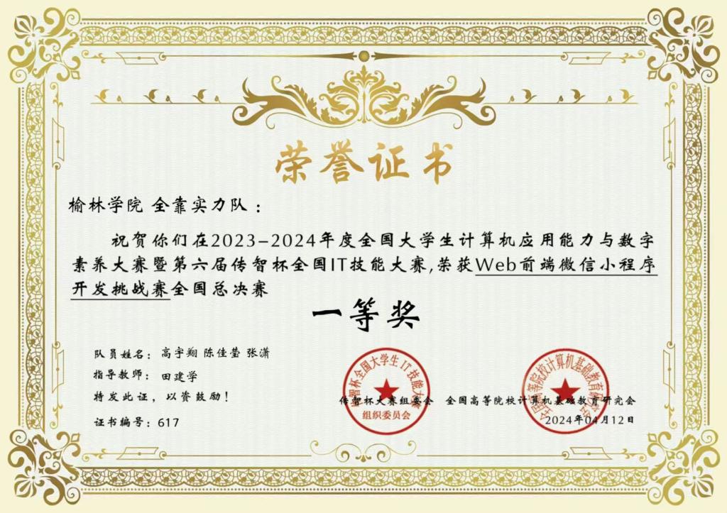 近日,由全国高等院校计算机基础教育研究会主办的第六届“传智杯”全国大学生IT技能大赛院——WEB前端微信小程序开发挑战赛成绩揭晓,由太阳成tyc234cc高宇翔、陈佳莹和张潇三名同学组队提交的作品最终获得全国总决赛一等奖。