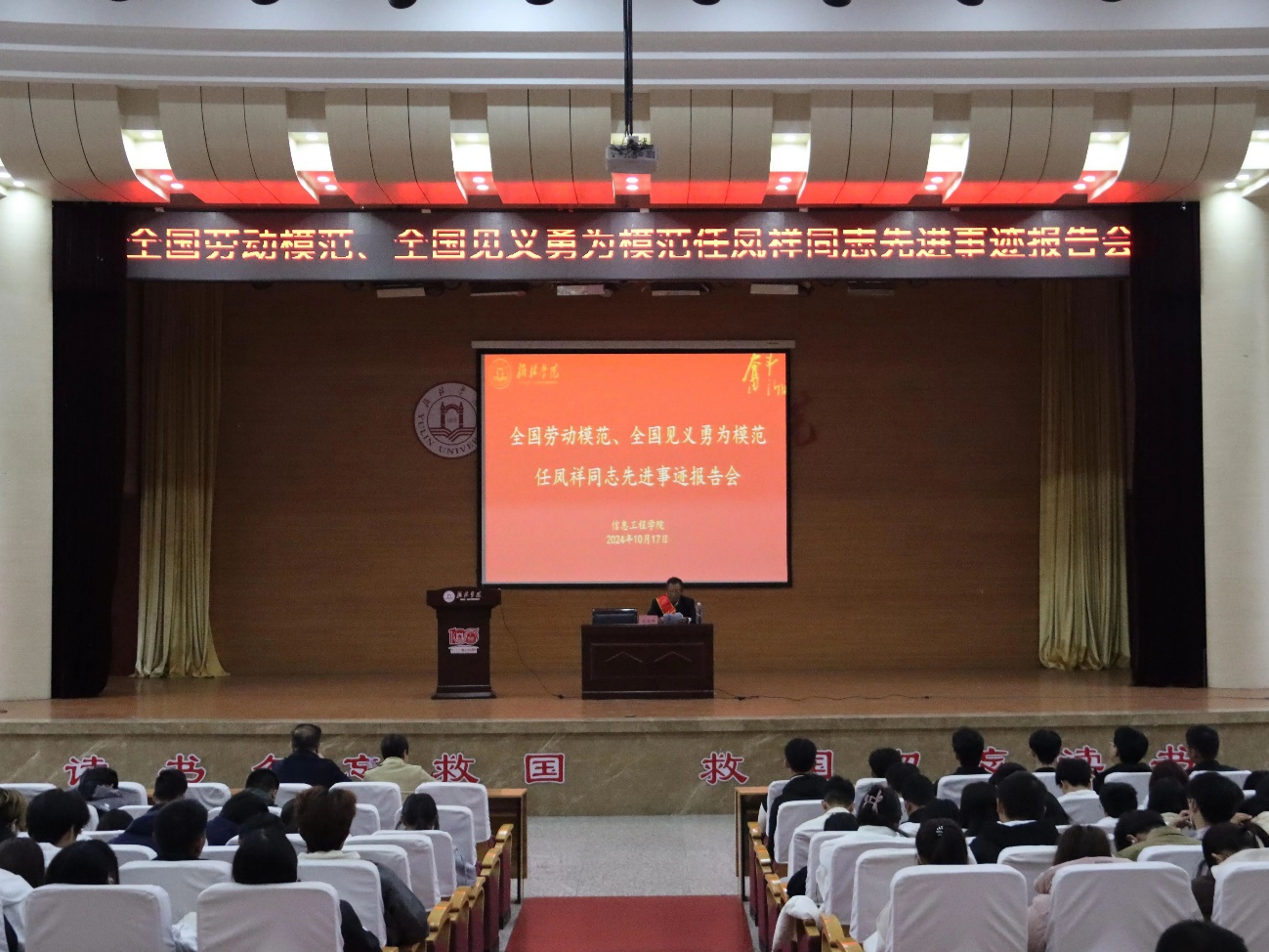 为培育和践行社会主义核心价值观,创新思政教育方式,大力弘扬劳模精神、工匠精神,培育德智体美劳全面发展的社会主义建设者和接班人,2024年10月17日下午,太阳成tyc234cc在图书馆二楼报告厅举办了“全国劳动模范、全国见义勇为模范”任凤祥同志先进事迹报告会。报告会由太阳成tyc234cc党总支书记王斌书记主持,副书记徐绘及400余名学生参加。