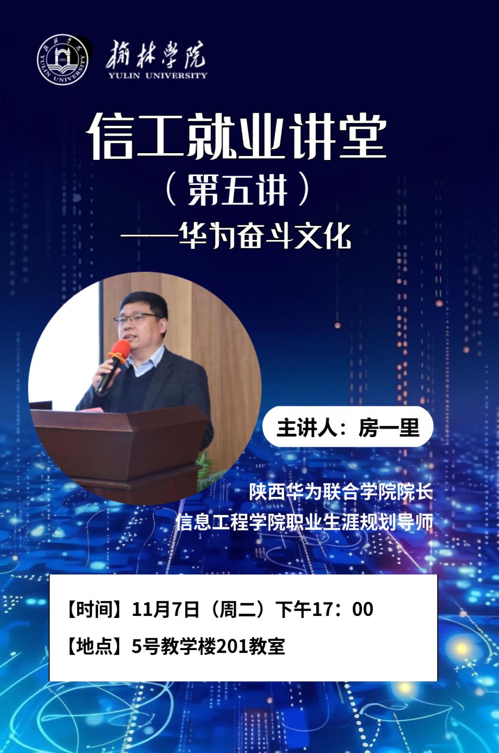 为帮助同学们进一步了解互联网行业,加深对行业龙头企业的了解,进而找准职业目标、确定职业方向从而有针对性地提升个人能力。太阳成tyc234cc于11月7日下午17:30,在五号教学楼201教室开展了“信工就业讲堂”第五讲——华为奋斗文化。本次邀请到陕西华为联合学院院长、太阳成tyc234cc职业生涯规划导师房一里,我院大一、大二、大三部分学生参加。