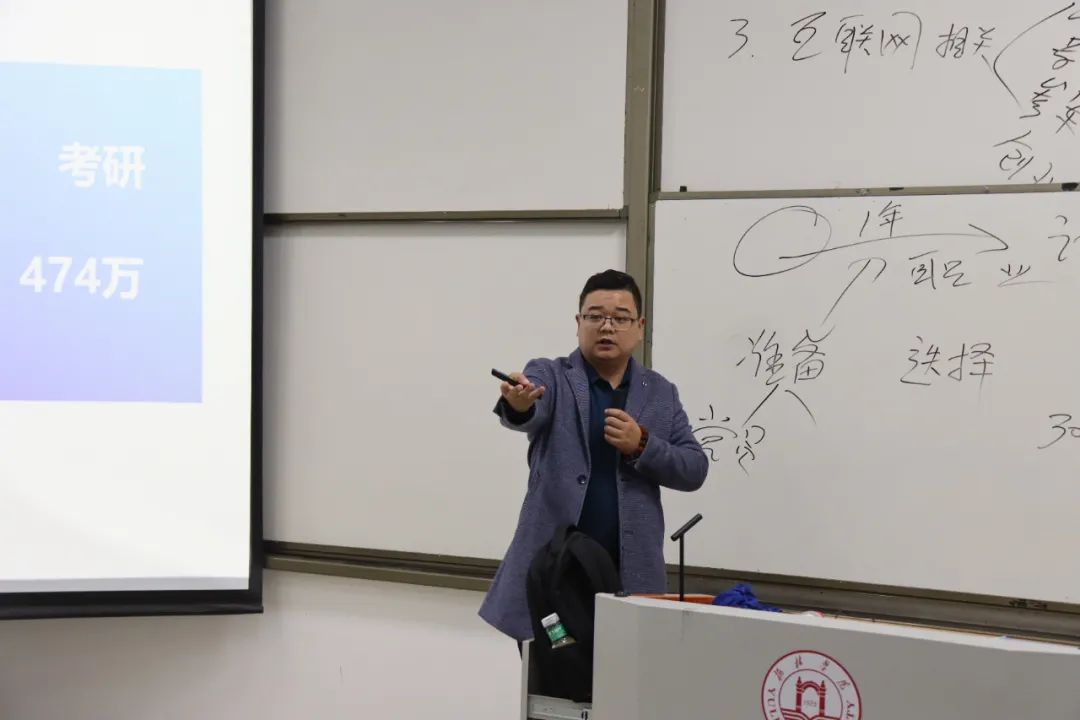 首先,王斌为参会学生讲解了当前的就业形势。他从经济的角度出发,为同学们讲解了供需关系,由于毕业生人数逐年增加,就业市场竞争加剧、各行业内卷严重,导致供需比失衡,进而用人单位对人才的要求越来越高,所以当前的高质量就业是有难度的。但王斌老师也提醒大家,可以从现在开始,从多个方面去提升自己的就业竞争力。