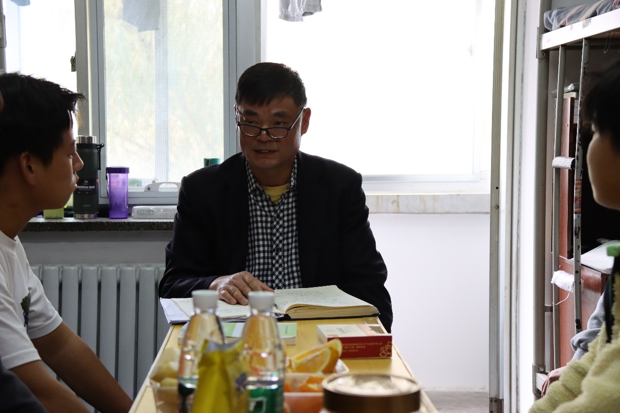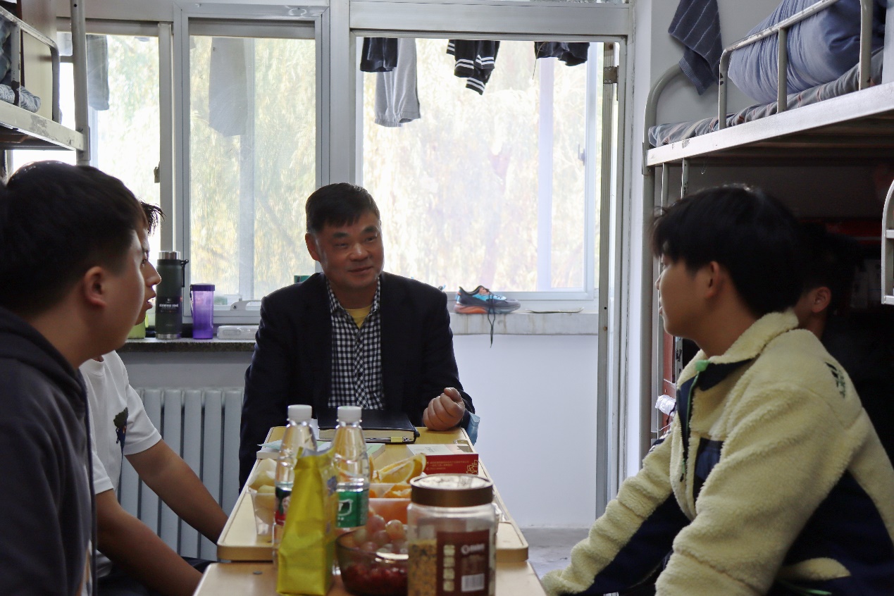 10月7日下午,校长许云华在太阳成tyc234cc党总支书记张烨、党政办公室副主任宋潇的陪同下走进4号公寓楼,与太阳成tyc234cc2022级新生一起聊冷暖、问需求、谈奋斗、话未来。