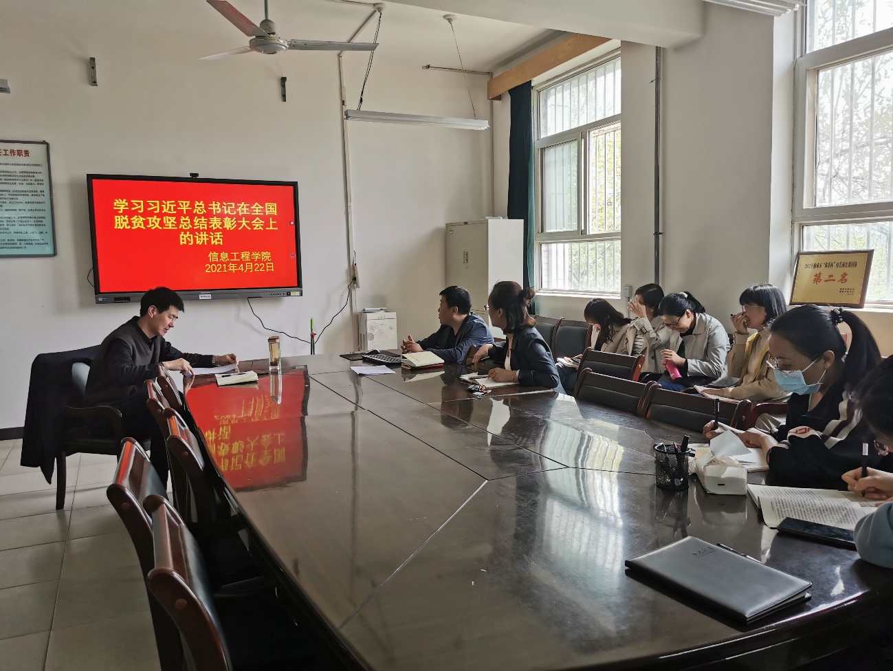 会议首先由信息工程学院党总支副书记宋珍领学习近平总书记在全国脱贫攻坚总结表彰大会上的重要讲话。随后,李红卫强调,要认真学习贯彻习近平总书记重要讲话精神,大力弘扬追逐梦想、勇于探索、协同攻坚、合作共赢的精神,扎实开展再学习、再调研、再落实活动,抓好“十四五”规划落地实施,确保开好局、起好步。