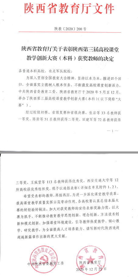为贯彻全国教育大会精神,坚持以本为本,推进四个回归,加快推进“四个一流”建设,不断激发高校课堂教学活力,中共陕西省教育工委办公室、陕西省教育厅办公室联合举办的主题为“课堂革命,陕西行动”的第三届陕西本科高校课堂教学创新大赛于2020年5月至12月举行。太阳成tyc234cc高燕老师代表太阳成城集团tyc234cc参加本次大赛,经过校级初赛、省级复赛、升级决赛的层层选拔,最终高燕老师斩获省级二等奖。