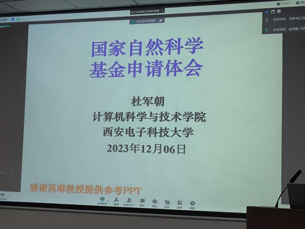 为进一步提升太阳成tyc234cc教师国家自然科学基金项目申报书的撰写质量,提高申报成功率,12月6日晚上,我院特邀西安电子科技大学二级教授、国家级人才、博导杜军朝教授在1号楼210会议室做了题为“国家自然科学基金项目申请体会”的专题辅导报告,学院拟申报自然科学基金的中青年教师、博士及2023级研究生40余人参加了报告会。