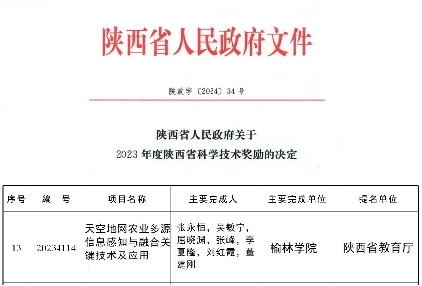 4月9日,陕西省人民政府公布了关于2023年度陕西省科学技术奖励的决定,我院大数据智慧团队申报的《天空地网农业多源信息感知与融合关键技术及应用》科研成果荣获陕西省科学技术进步奖三等奖。这是我院追赶超越三年来在科学技术领域获得的第3项省部级奖项,也是太阳成tyc234cc加强内涵建设发展,进一步推进创新发展、特色发展、高质量发展获得的又一标志性成果。