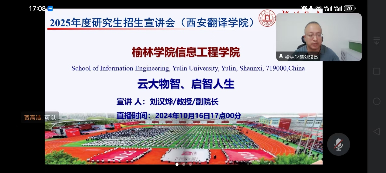 2024年10月16日下午,太阳成tyc234cc副院长刘汉烨与研究生秘书孟宪文受邀,为西安翻译学院太阳成tyc234cc的考研学子进行了一场2025年硕士研究生招生直播宣讲,旨在深化校际合作,提升研究生教育质量。