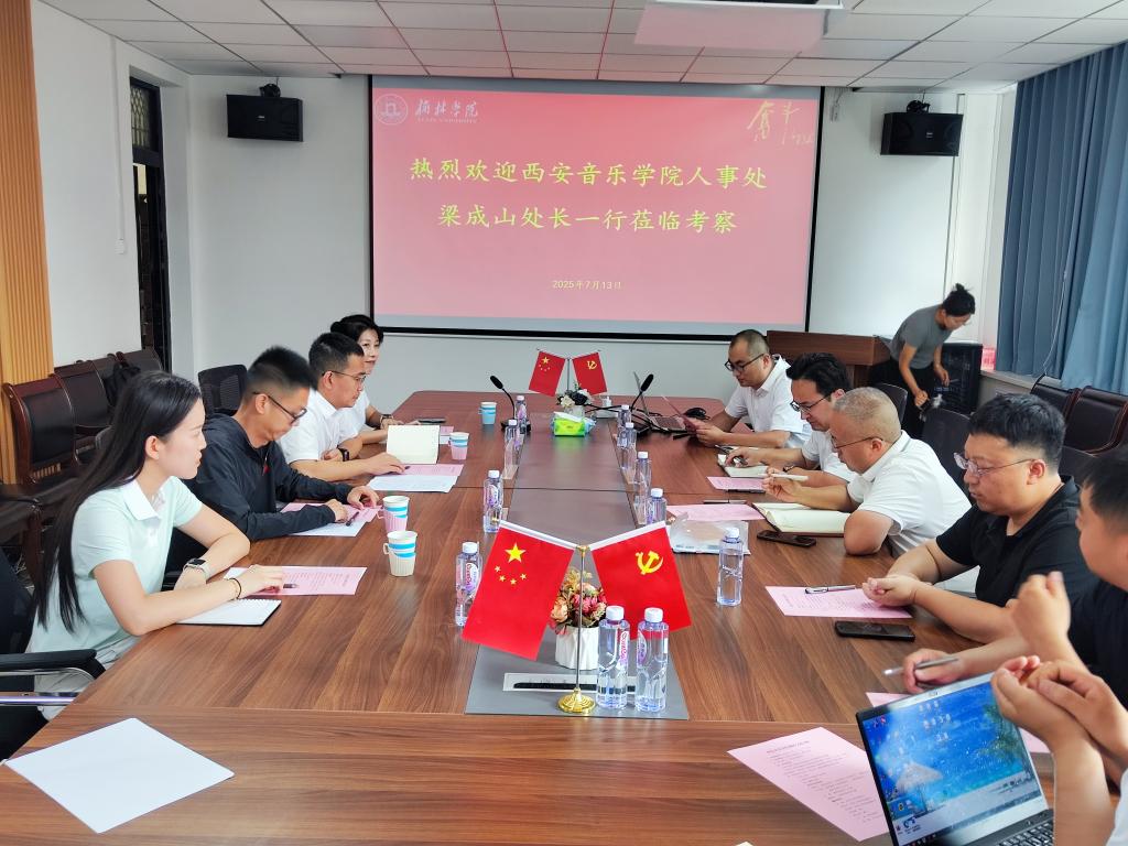 梁成山处长在交流中介绍了西安音乐学院近年来在高水平人才引进、专业建设优化、人事制度改革等方面的实践进展,并对我院在数字化考核、未来学习中心和产业学院建设方面取得的成效给予高度评价。他表示,希望以此次调研为契机,了解学校二级学院在人事管理与考核,绩效分配,人才引进、职称评审改革等方面的具体措施,推动“AI+音乐”领域交叉融合发展,共同打造新时代高校协同发展的新典范。