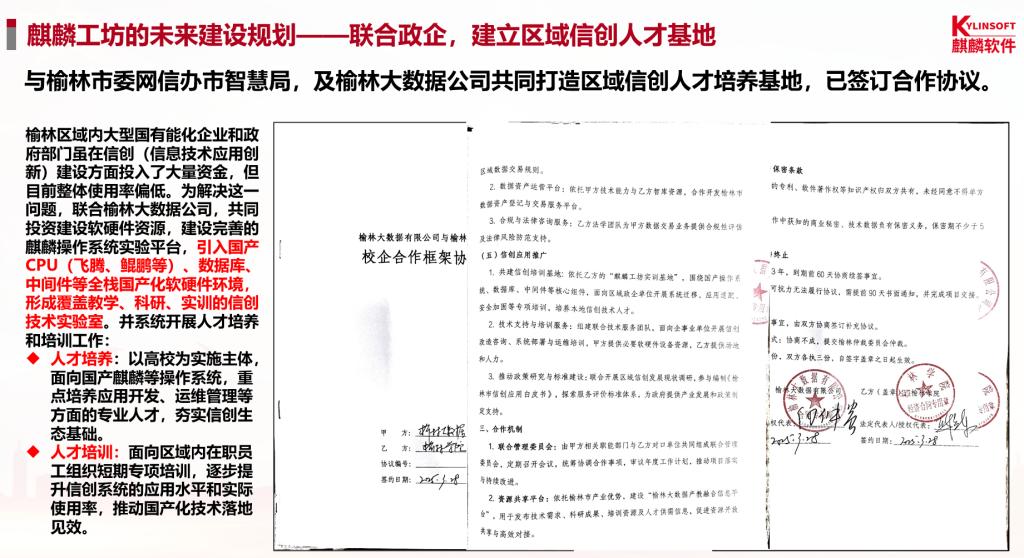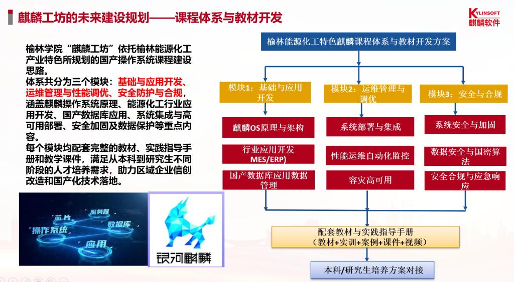 “麒麟工坊”实训基地建设紧密结合榆林高端能源化工产业和政务系统的信创应用场景,将为我校学生打造一个高质量、高水平的实践平台,全面提升其在真实环境中的技术能力与产业适应力。基地将与合作企业共同引入国产芯片、操作系统、数据库等先进技术与教学资源,构建贴近真实场景的实践环境,让学生在项目中锤炼技能、在实战中提升能力,切实增强信创产品研发与应用的核心竞争力,为服务国家信息技术自主可控战略目标夯实人才基础。