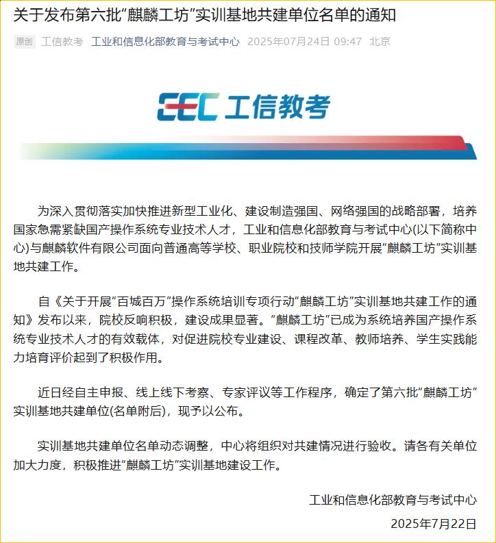 近日,工业和信息化部教育与考试中心公布第六批“麒麟工坊”实训基地共建单位名单,太阳成城集团tyc234cc人工智能产业学院申报项目成功入选!这是学院在服务国家信息技术应用创新战略、深化产教融合方面取得的又一重大突破,标志着我校信创人才培养体系建设迈入国家级平台新阶段。