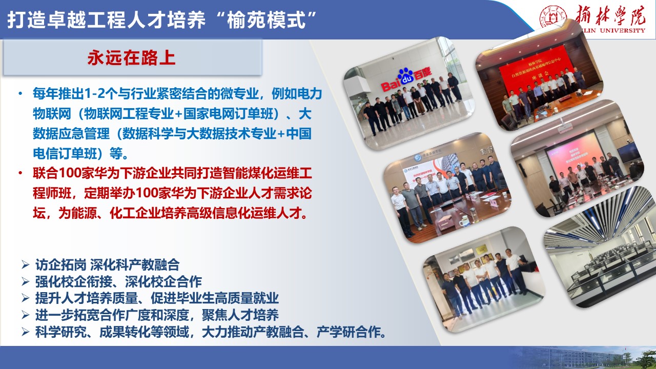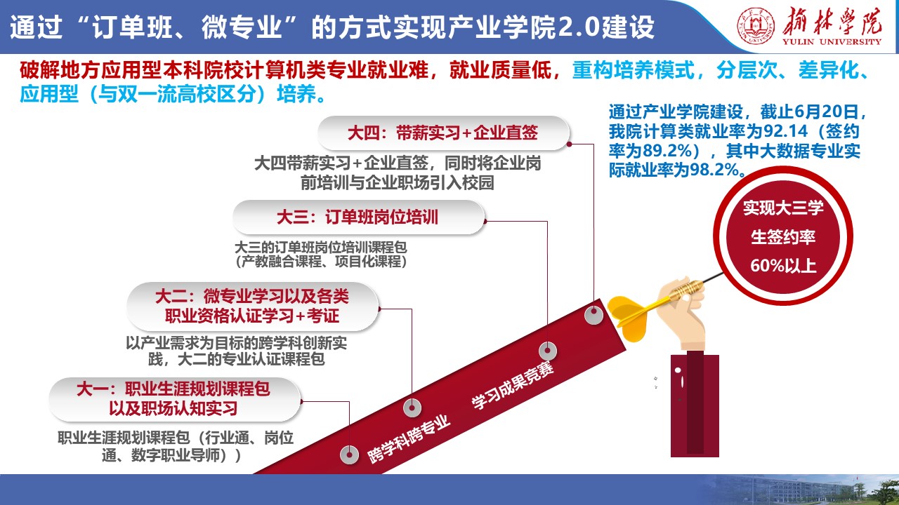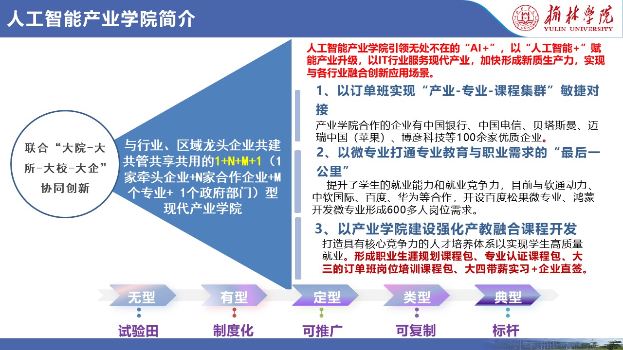人工智能产业学院是太阳成tyc234cc在调研华为、百度、科大讯飞、中煤陕西能源化工集团有限公司、陕西华电榆横煤电有限责任公司自、然资源部陕西基础地理信息中心、西安文理学院数字产业学院、东莞理工学院产业学院等30多家企业、高校运行经验的基础上,依托于微专业以及多个校企合作数字产业订单班,于2024年3月开始筹建。人工智能产业学院是我校顺应科技进步和产业变革大趋势,联合“大院-大所-大校-大企”协同创新,与行业、区域龙头企业共建共管共享共用的1+N+M+1(1家牵头企业+N家合作企业+M个专业+ 1个政府部门)型现代产业学院,采用四层次课程包的方式把产教融合课程、项目化课程嵌入人才培养方案以及开办订单班和微专业的形式开展产业学院建设,以就业数据分析、测试类等通用技能岗位和IT行业售前、售后等服务类岗位进行分层次、差异化、应用型(与双一流高校区分)培养,是我校推动人才培养模式深层次变革的重大举措。